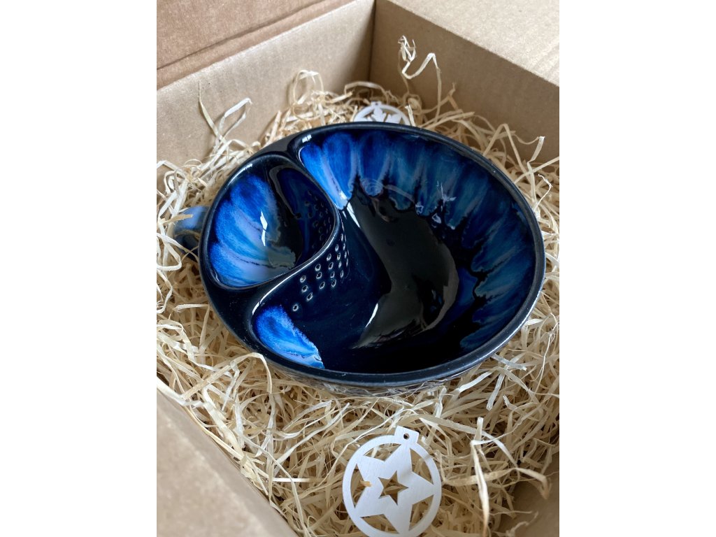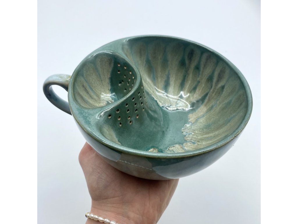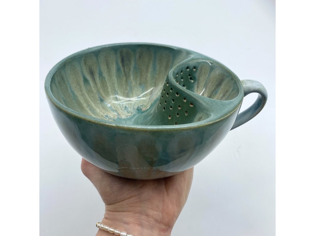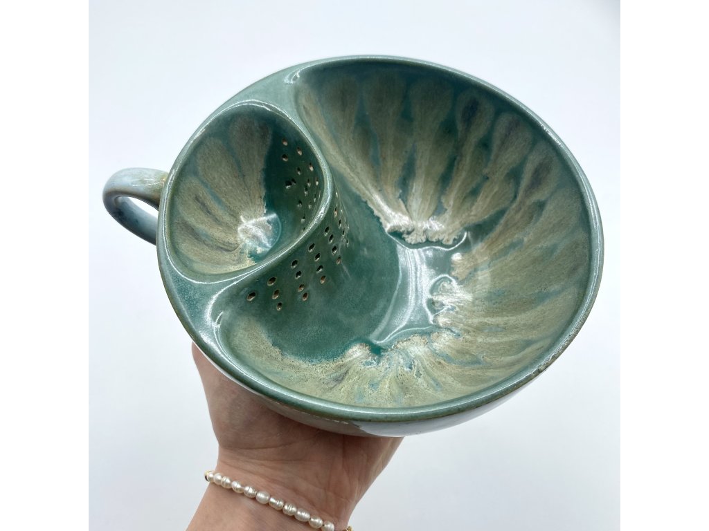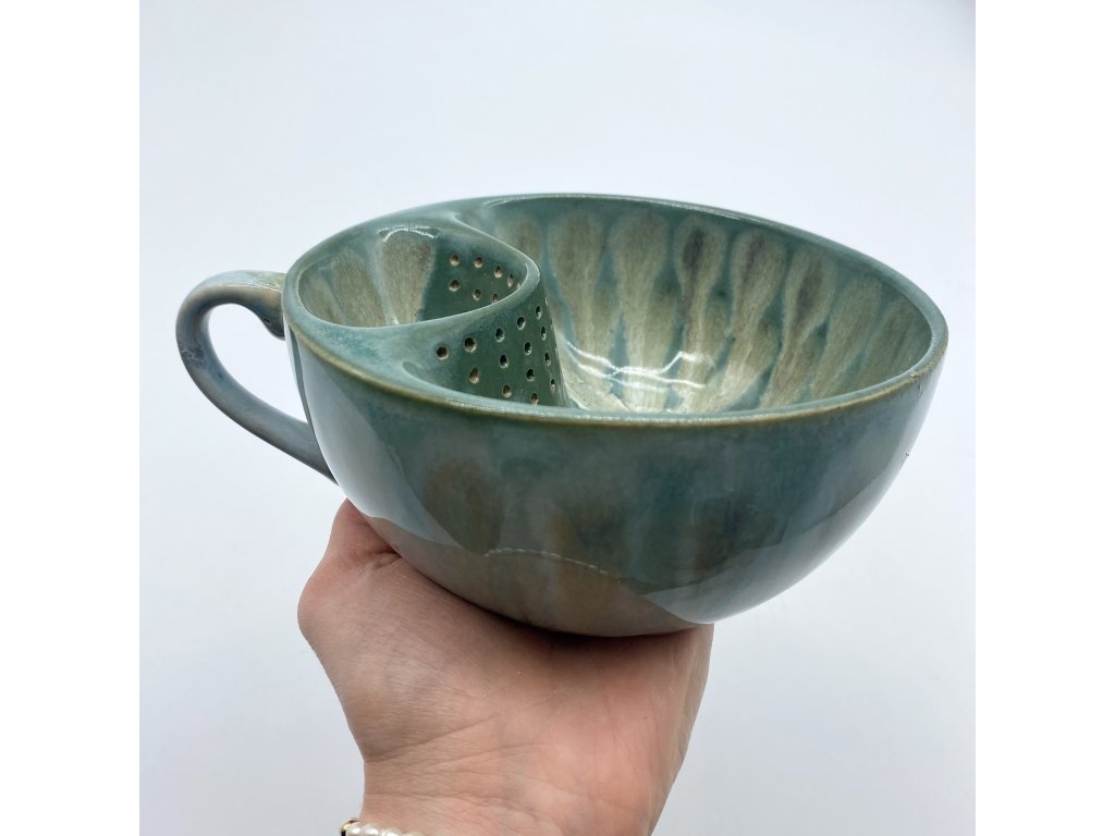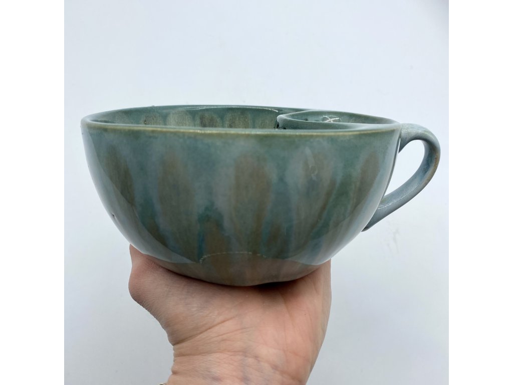 Dostupnost: Skladem Můžeme doručit do: 26.2.2026Hmotnost cca 0,3 kg Velikost - průměr s ouškem cca 16 cm Velikost - výška cca 6,5 cm Barva šedozelená glazura se stékanými malovanými efekty Tvar kapsička s dírkami na luhování hrubšího sypaného čaje Objem cca 300 ml -