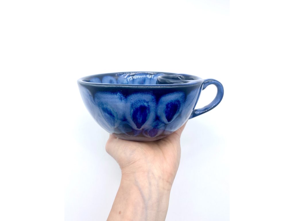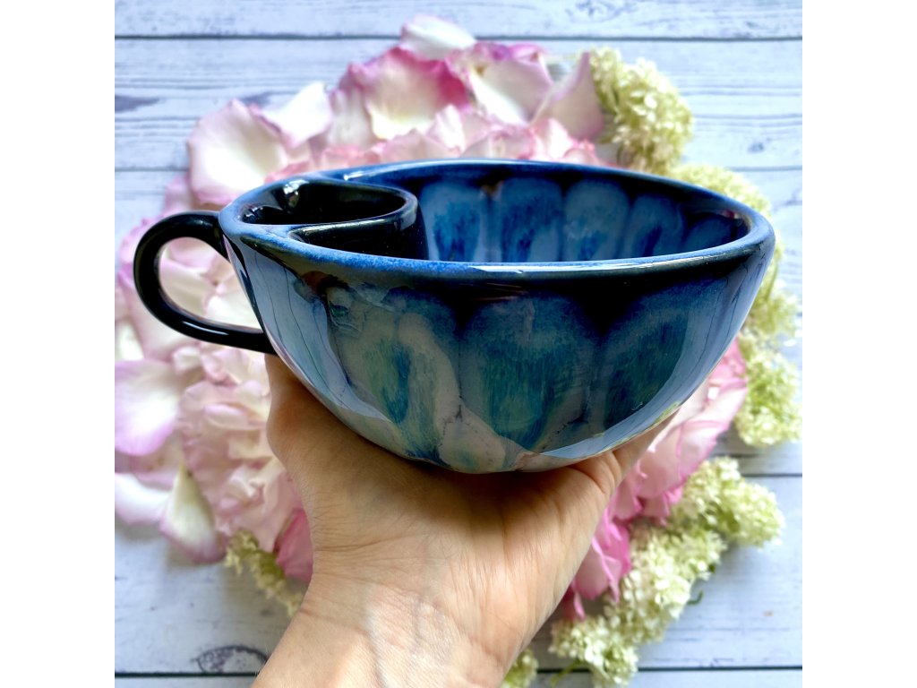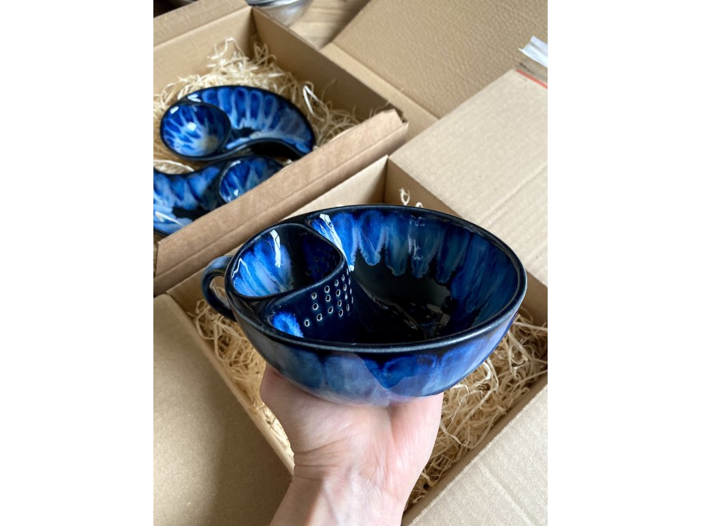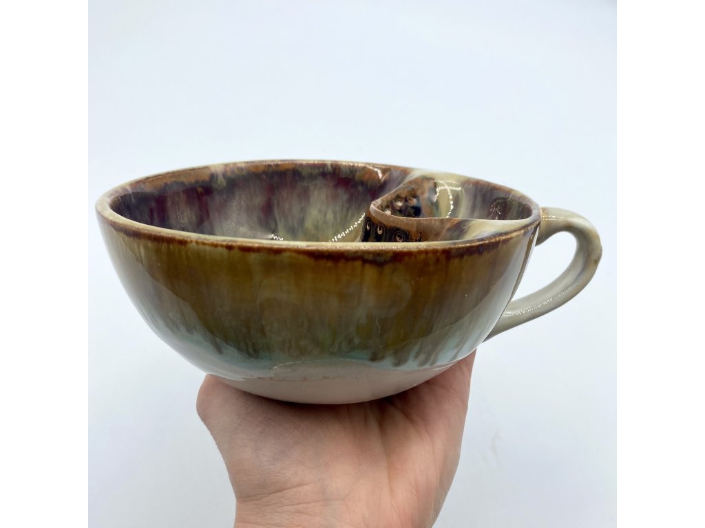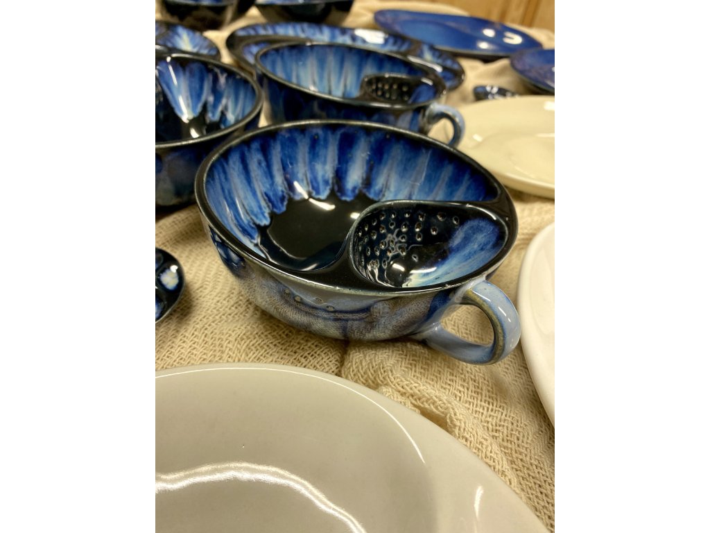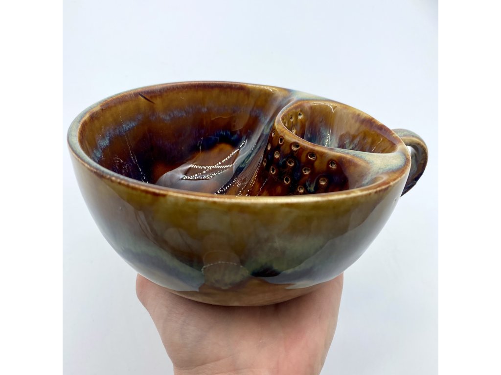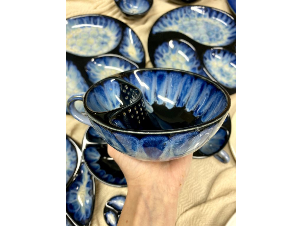 Dostupnost: Skladem Můžeme doručit do: 26.2.2026Hmotnost cca 0,3 kg Velikost - průměr s ouškem cca 16 cm Velikost - výška cca 6,5 cm Barva šedozelená glazura se stékanými malovanými efekty Tvar kapsička s dírkami na luhování hrubšího sypaného čaje Objem cca 300 ml -