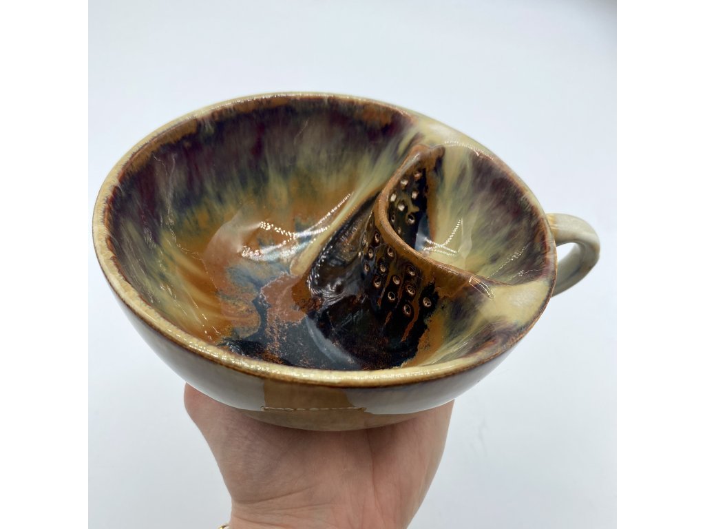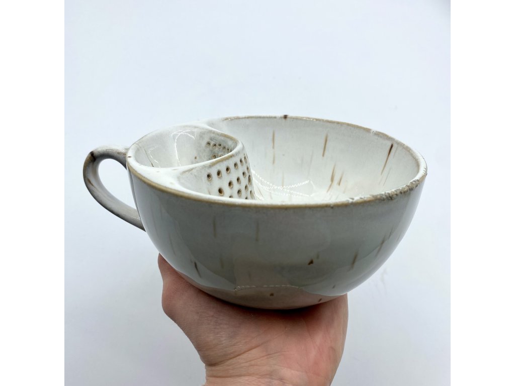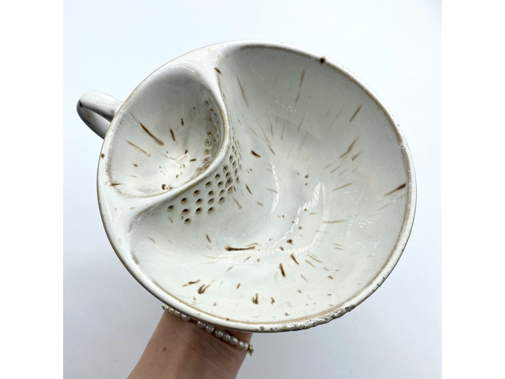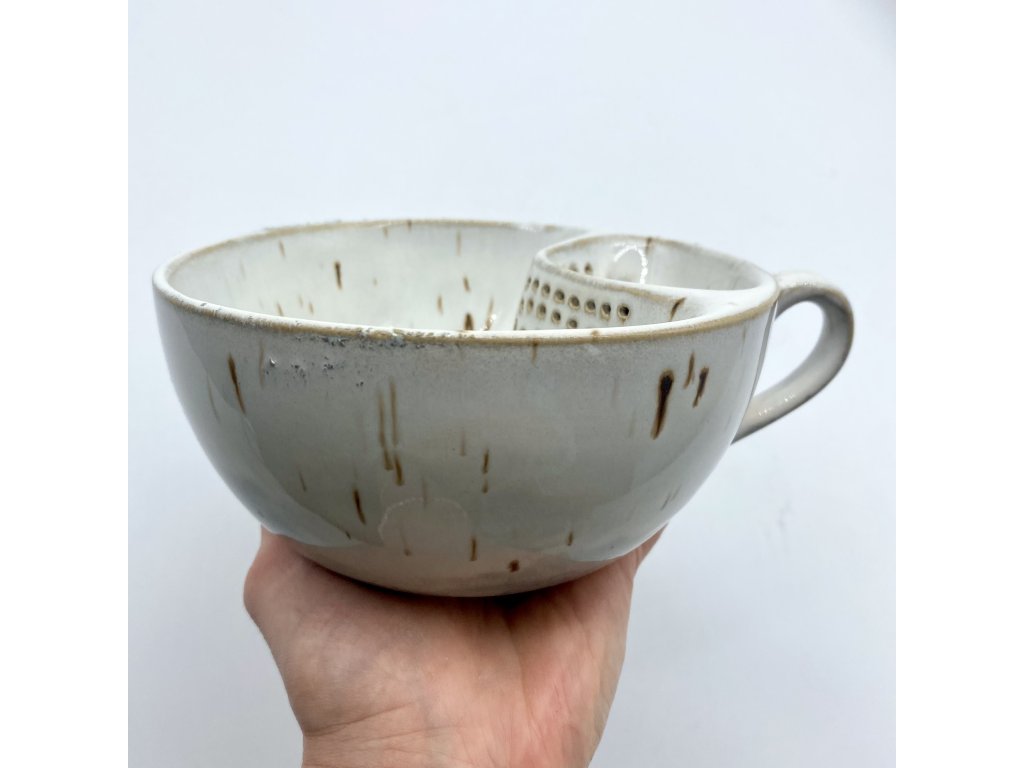 Dostupnost: Skladem Můžeme doručit do: 26.2.2026Hmotnost cca 0,3 kg Velikost - průměr s ouškem cca 16 cm Velikost - výška cca 6,5 cm Barva bílá s hnědými efekty Upozornění glazura je ve spodní části v tenké vrstvičce a je méně sytá, na jedné boční straně má glazura na hmat drsnější výstupky Tvar kapsička s dírkami na luhování hrubšího sypaného čaje -