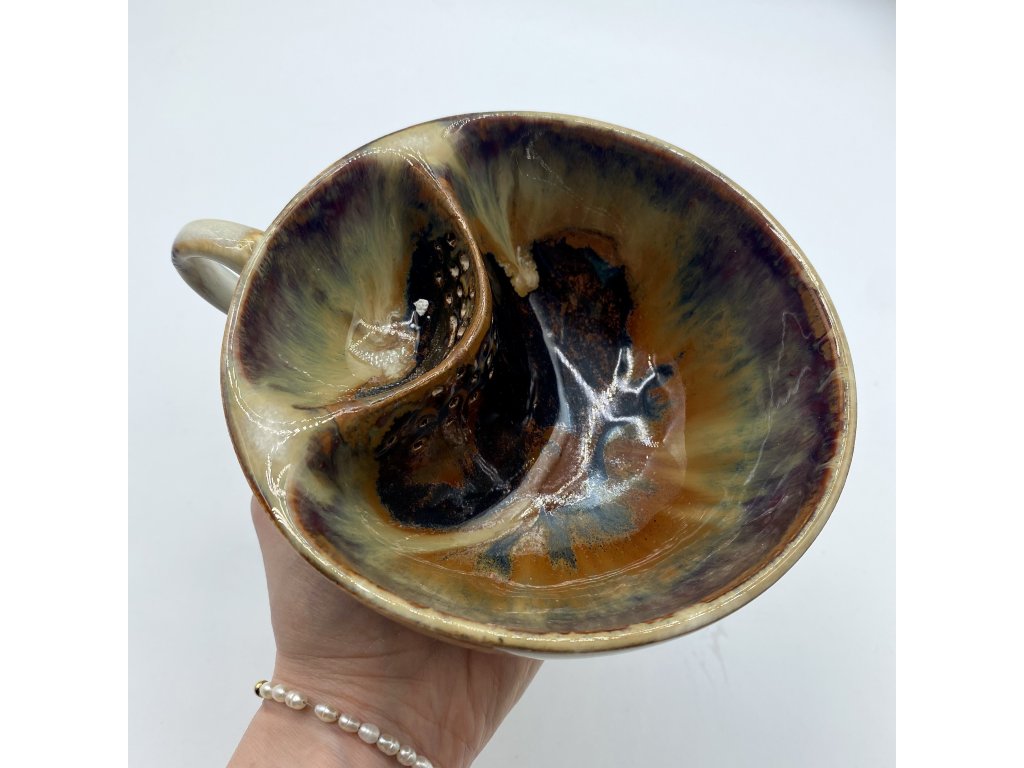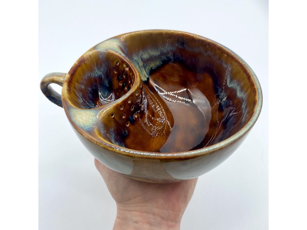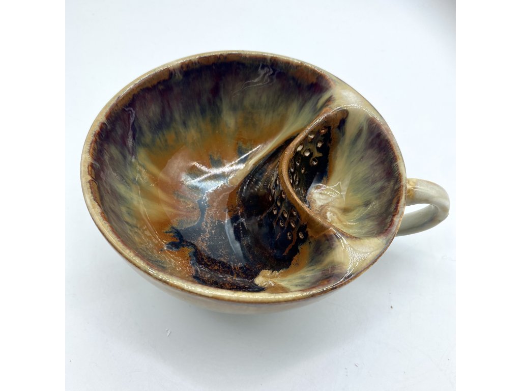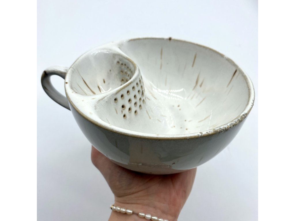 Dostupnost: Skladem Můžeme doručit do: 26.2.2026Hmotnost cca 0,3 kg Velikost - průměr s ouškem cca 16 cm Velikost - výška cca 6,5 cm Barva bílá s hnědými efekty Upozornění glazura je ve spodní části v tenké vrstvičce a je méně sytá, na jedné boční straně má glazura na hmat drsnější výstupky Tvar kapsička s dírkami na luhování hrubšího sypaného čaje -