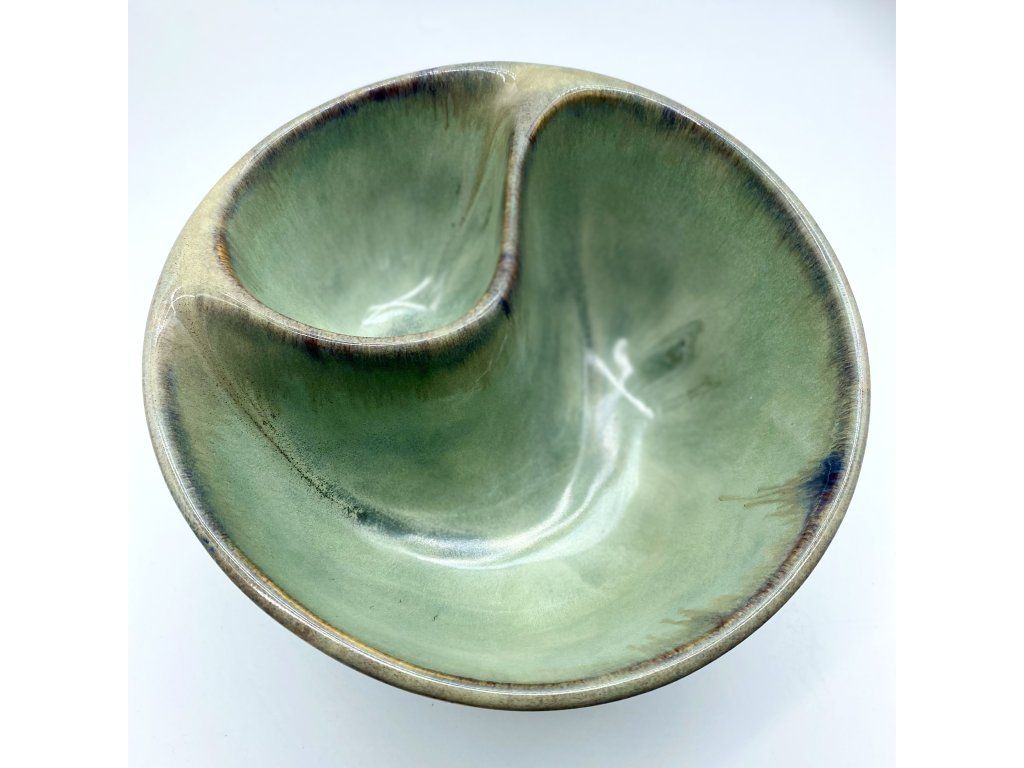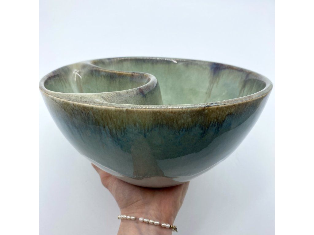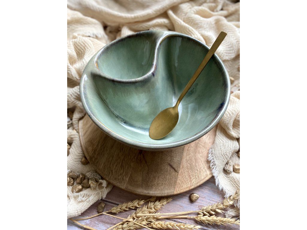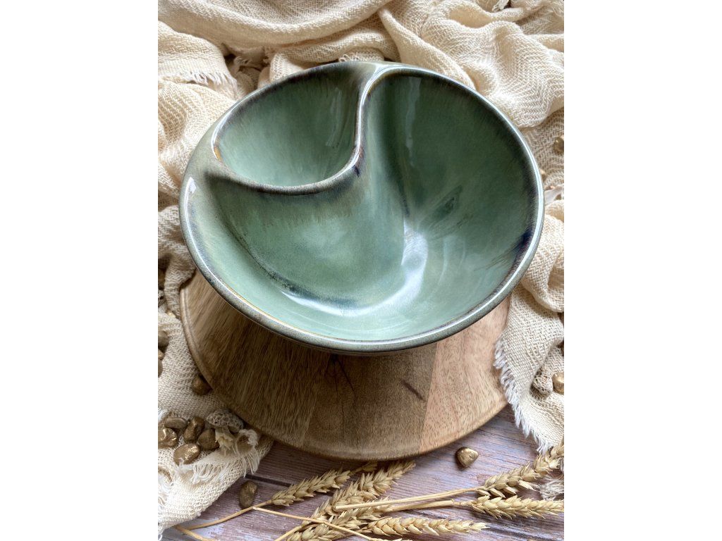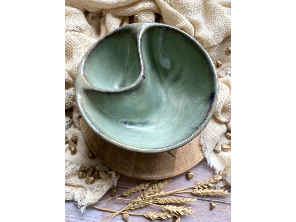 Můžeme doručit do: 14.4.2026Velikost - průměr cca 24 cm Velikost - výška cca 11 cm Barva šedozelená glazura se stékanými tmavými a světlými efekty Objem velká komůrka - 1 litr, malá - 300 ml